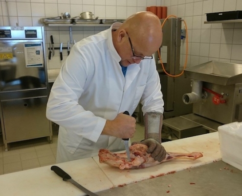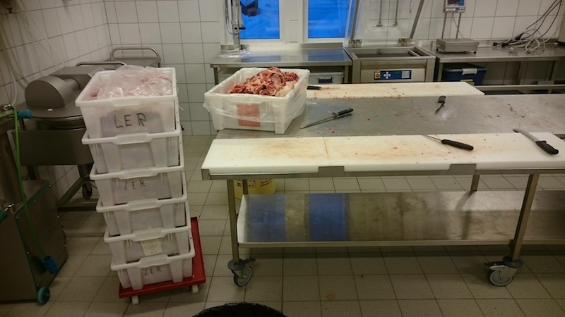 I dag har Lars Erik og Frank vore i full jobb på foredlingsanlegget til Mo og Øyrane VGS. Dei har skore ned over 150 kg økologisk villsaukjøt, som vi har kjøpt på ei naboøy. Etter at kjøtet er skore frå beina er det opp i den store kjøtkverna, og så går det vidare til kjøtkakka der saltet blit blanda inn. Det einaste vi tilset villsaukjøtet er salt utan nitrit. Tidlegare har vi brukt 40 gram salt pr kilo kjøt. Denne gongen har vi gått ned til 35 gram salt.